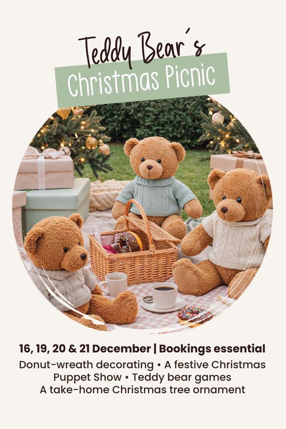 Bring your teddy or favourite fluffy friend and enjoy a teddy’s picnic with us with games, decorating donuts and a special Christmas puppet show. Children will receive a small Christmas Tree decoration they can take home to decorate and hang on their tree.
